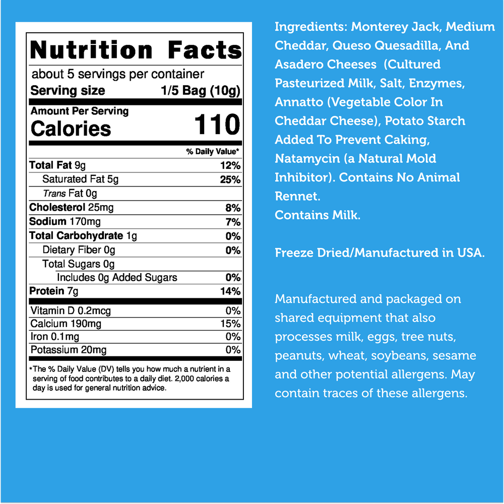 Freeze-Dried Mexican Blend Cheese – Monterey Jack, Cheddar, Queso Quesadilla & Asadero, 100% Real Cheese Snack (1.85oz | 6.8oz | 40oz Bulk Bag)