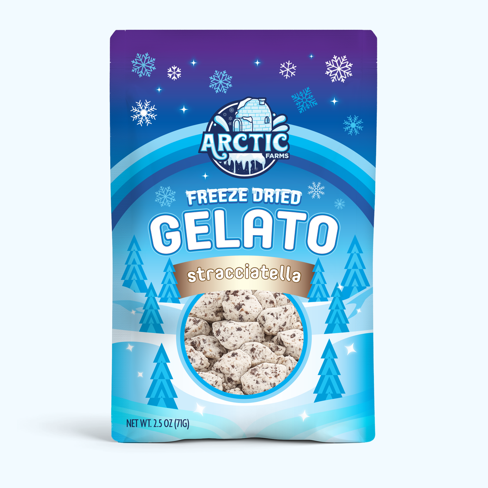Arctic Farms Freeze‑Dried Gelato captures the elegance of traditional stracciatella: smooth, sweet cream gelato infused with thin, crunchy chocolate shards that melt seamlessly into each bite. The result is a light, airy crunch that dissolves into rich, creamy flavor with subtle chocolate notes. It’s a refined, timeless Italian dessert reimagined as a modern, portable, mess‑free snack.
