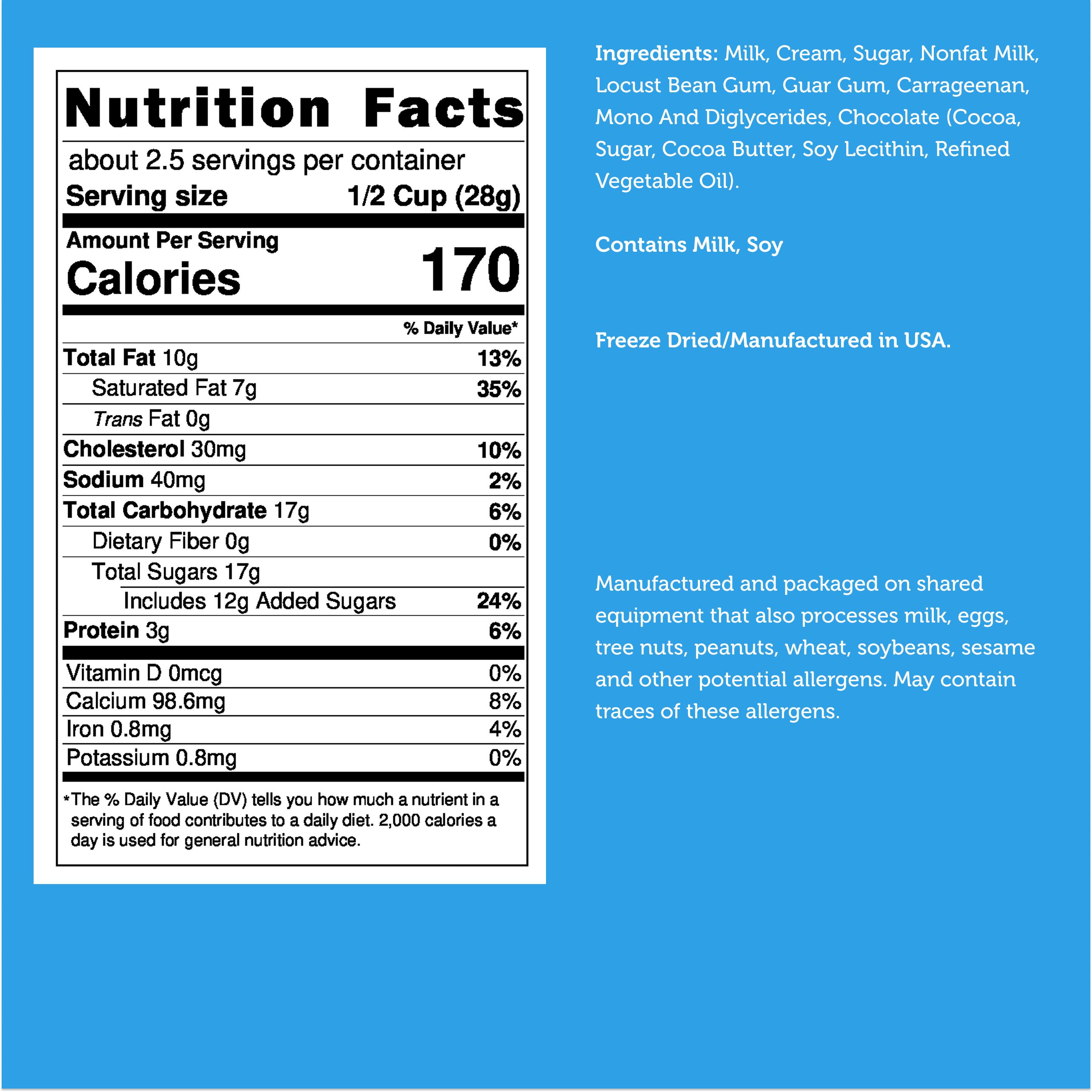 The freeze‑drying process preserves the gelato’s clean dairy flavor and delicate chocolate texture while creating a crisp bite perfect for everyday snacking, dessert boards, gifting, or adding a gourmet touch to party bowls and care packages.
