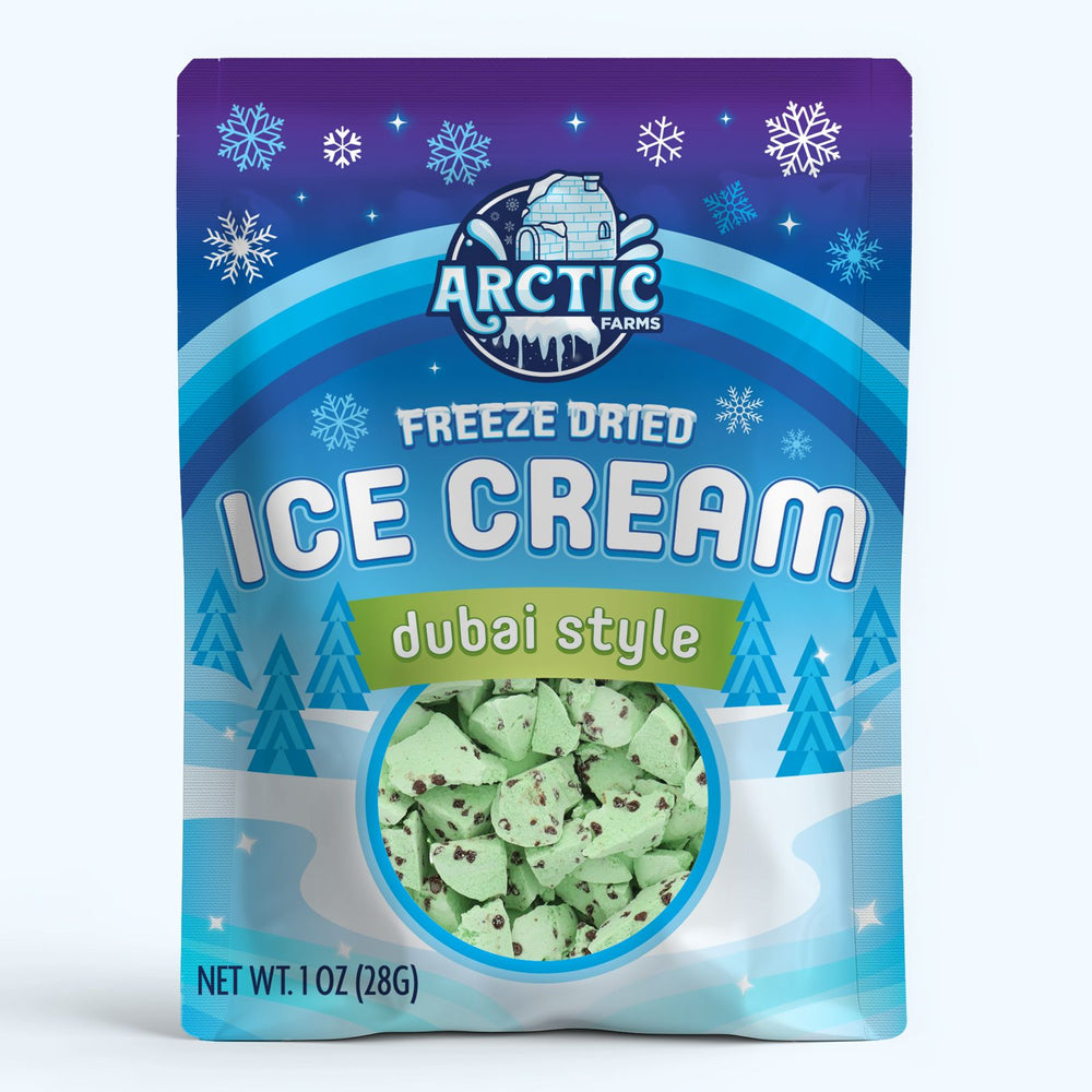 Indulge in luxury with Arctic Farms’ Freeze-Dried Dubai Style Ice Cream—a sophisticated blend of nutty pistachio with rich chocolate Chips, freeze-dried to perfection. Inspired by Dubai’s iconic taste profiles, this lightweight treat delivers a bold crunch with every bite. Whether you’re snacking at home, traveling light, or curating gourmet bundles, this dessert offers an elevated twist on traditional ice cream—no melting required.