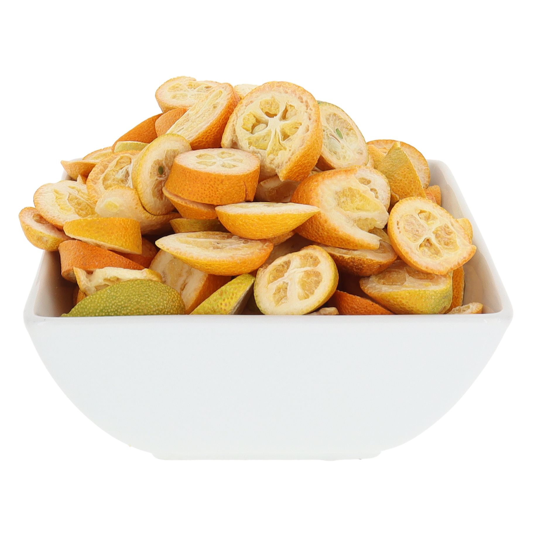 Kumquats bring a uniquely bold citrus flavor—sweet peel, tart center—making these freeze-dried slices a standout exotic fruit snack with vibrant aroma and clean-label purity.