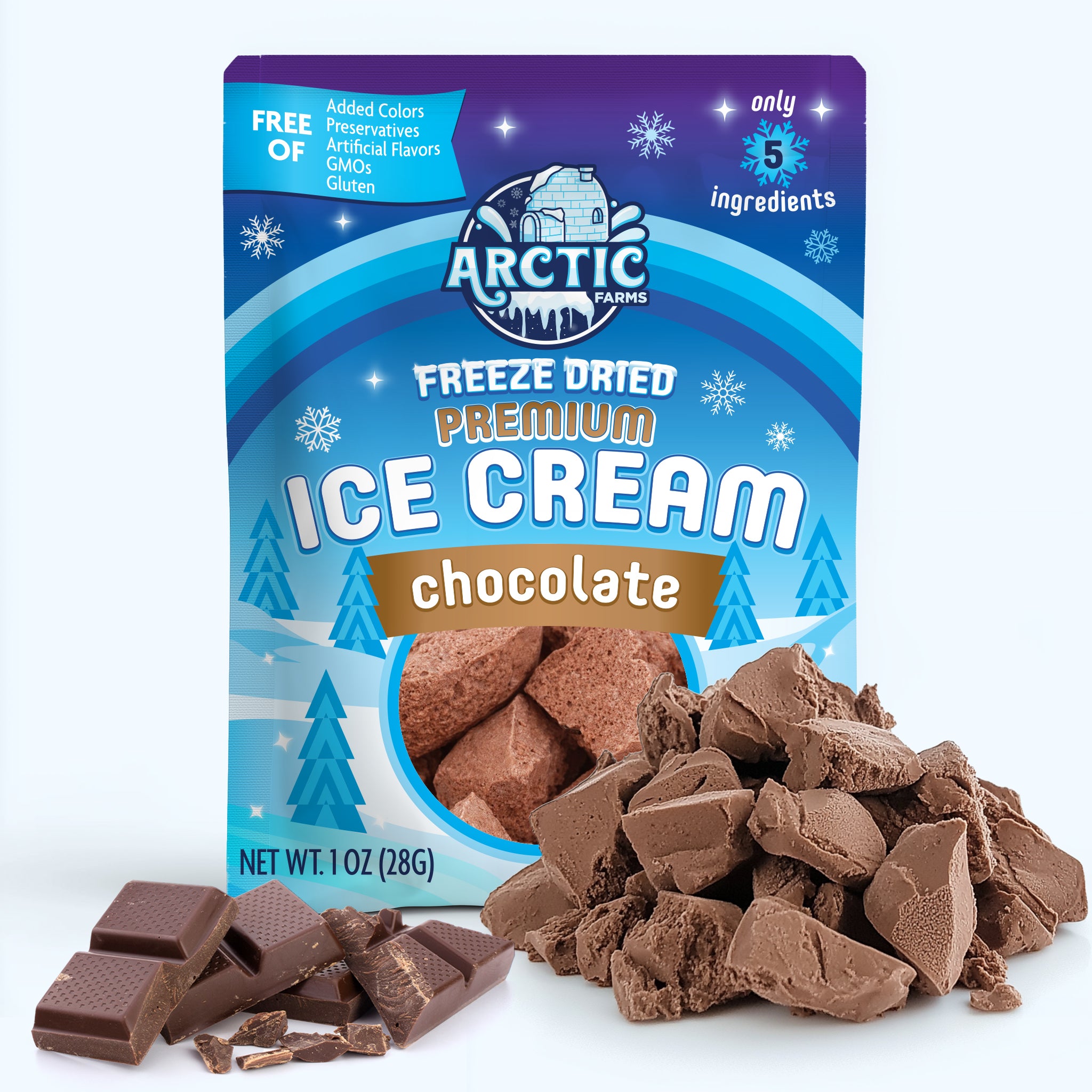 Arctic Farms Premium Freeze‑Dried Ice Cream delivers deep cocoa richness in a light, airy crunch that dissolves into smooth, creamy chocolate flavor. Made from a five‑ingredient chocolate ice cream base, this dessert snack captures bold cocoa notes with a naturally balanced sweetness, all preserved through gentle freeze‑drying.