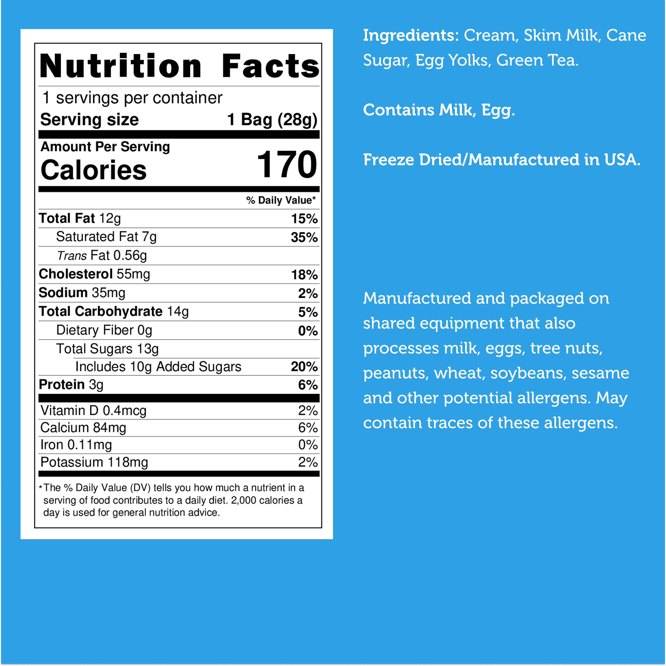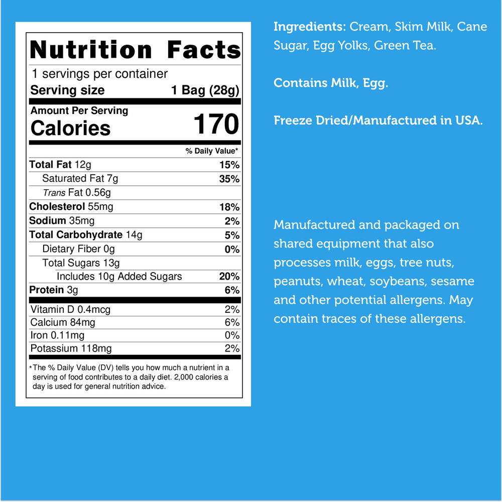The freeze‑drying process locks in the ice cream’s bold matcha taste while creating a crisp texture perfect for everyday snacking, dessert boards, gifting, or adding a gourmet touch to care packages and travel snacks. It’s a modern, shelf‑stable way to enjoy matcha ice cream without melting, mess, or additives.