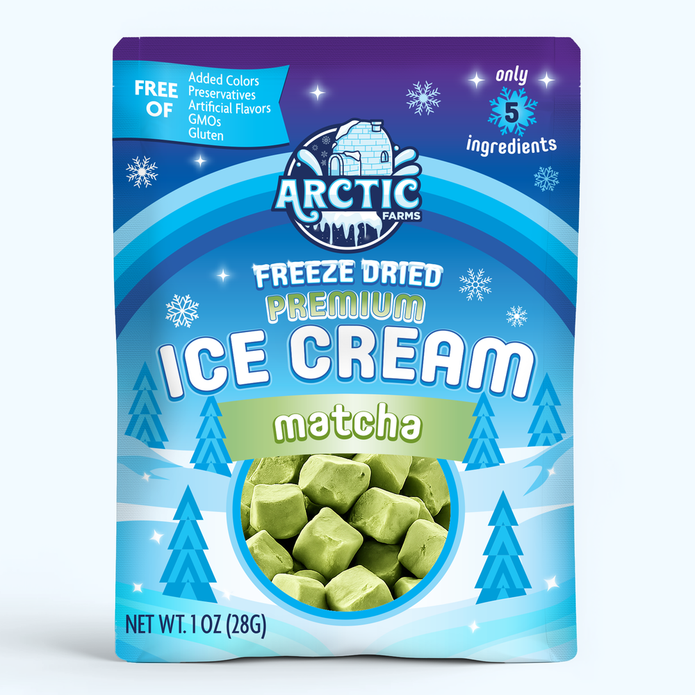 Arctic Farms Premium Freeze‑Dried Ice Cream delivers the earthy, vibrant flavor of authentic matcha with a smooth, creamy finish—preserved in a light, airy crunch that dissolves into rich ice cream flavor. Made with only five simple ingredients, this matcha dessert snack is pure, balanced, and naturally satisfying.